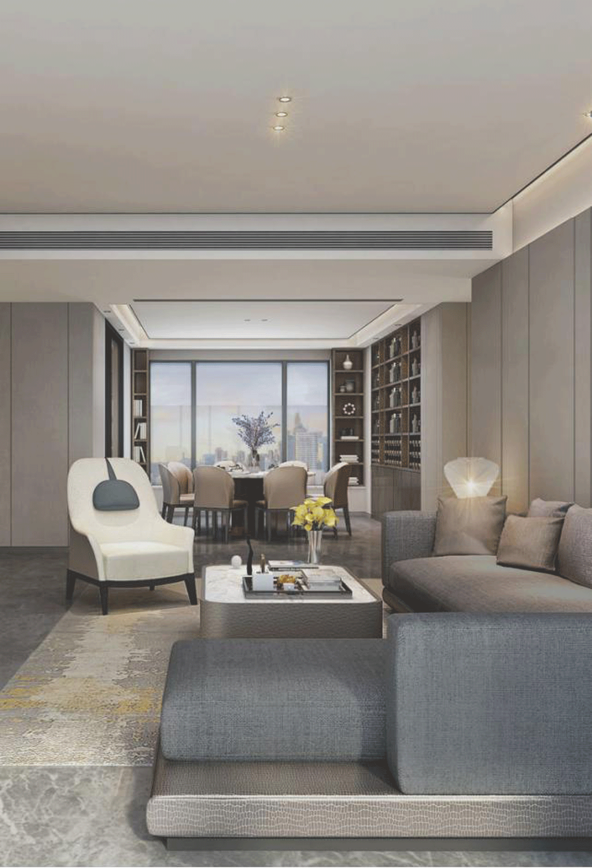 选材上,运用玻璃幕墙+装饰构件+涂料+干挂石,营造素雅、通透的立面效果。