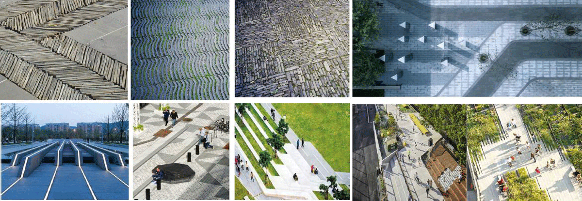 在铺装、景观墙体等构筑物的处理上,将传统与现代的景观材料进行合理的搭配,体现中国现代的景观设计,如传统的瓦片、青砖、卵石和现代的石材、金属、玻璃等材料结合在一起,在肌理、颜色、质感等方面形成对比和反差效果,达成和谐统一、简洁大气。